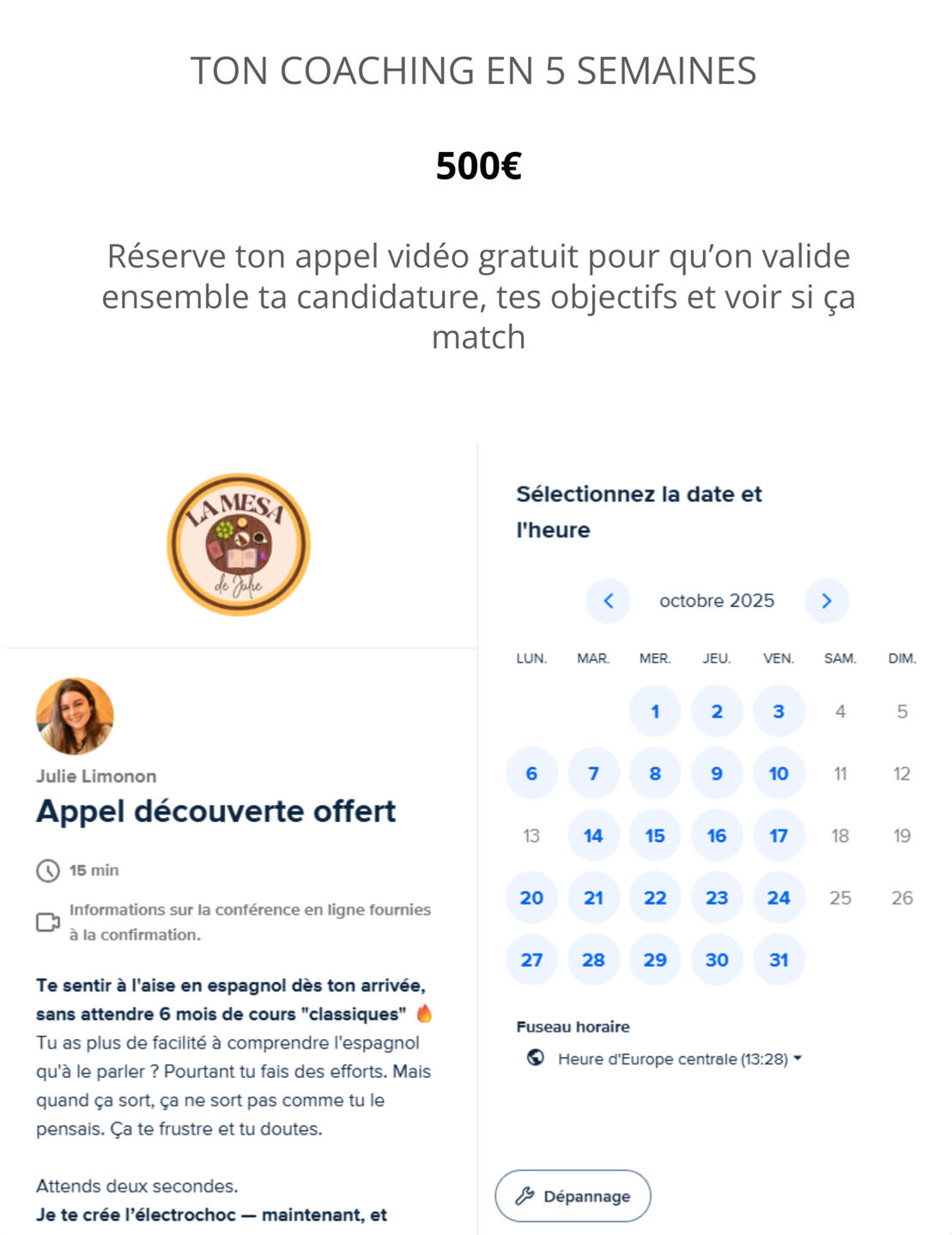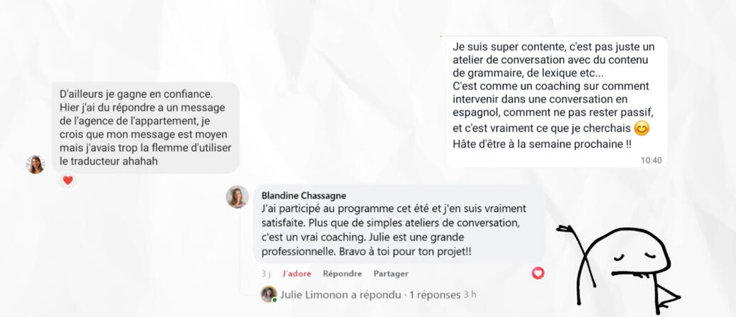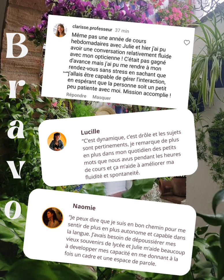 C’est pour ça que j’ai créé La Mesa de Julie : le premier coaching d’espagnol pour pratiquer les situations que tu vivras dès ton arrivée.🎯 Mon objectif : que tu poses un pied en Espagne et que tu te sentes prêt·e à discuter avec ton proprio, le boulanger ou ton futur collègue — sans stress, sans blocage.