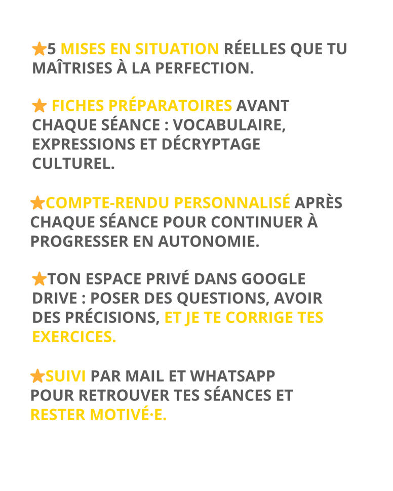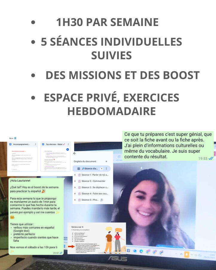 Tu pars vivre en Espagne et tu as un projet à concrétiser. Tu connais déjà des phrases, elles sont dans ta tête… mais dès qu’il faut parler : bug, stress, blocage. Tu as essayé les applis, les séries, les cours… mais tu sens bien que ça ne suffit pas.Et au fond.. tu sais que le problème c'est pas toi... Mais que tu n'as pas encore trouvé cette méthode qui te permettra de briller.Ce programme est fait pour toi si tu veux :