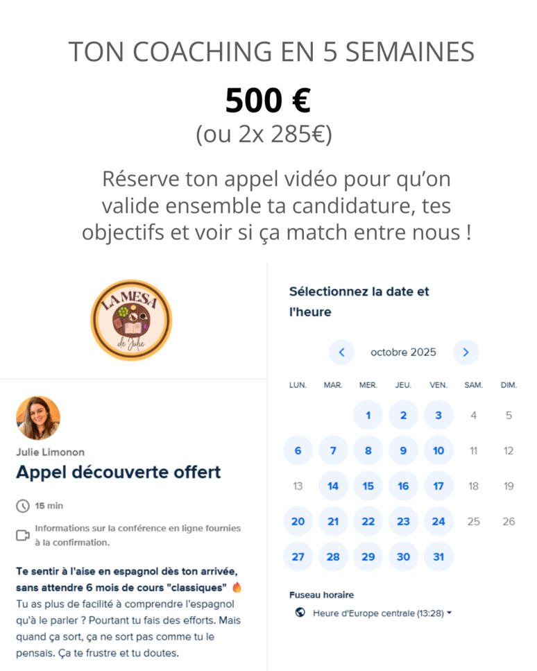 C’est pour ça que j’ai créé La Mesa de Julie : le premier coaching d’espagnol pour pratiquer les situations que tu vivras dès ton arrivée.🎯 Mon objectif : que tu poses un pied en Espagne et que tu te sentes prêt·e à discuter avec ton proprio, le boulanger ou ton futur collègue — sans stress, sans blocage.